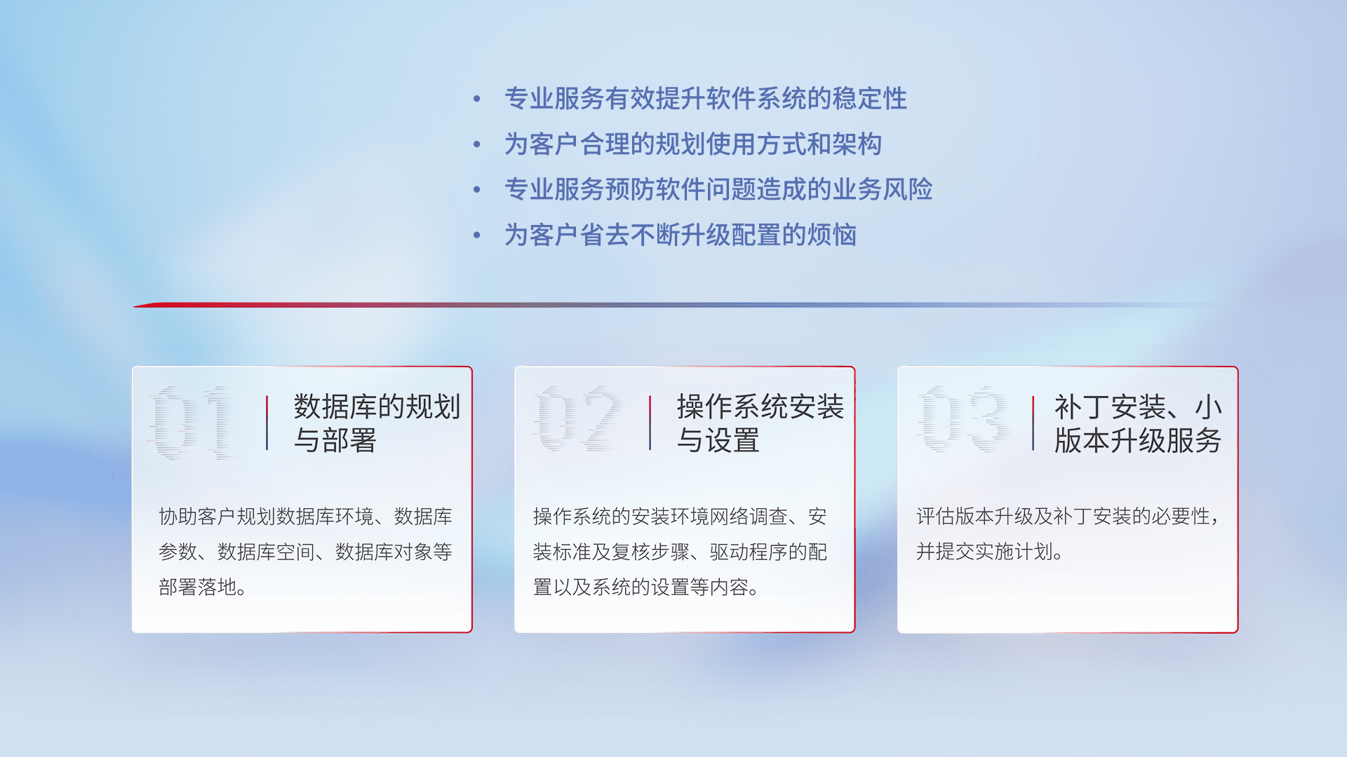 为客户提供软件规模升级、、、、快速部署、、按需配置的专业服务,,从数据库的规划与部署到操作系统的安装与设置,,,再到补丁安装和小版本升级提供支持。。。